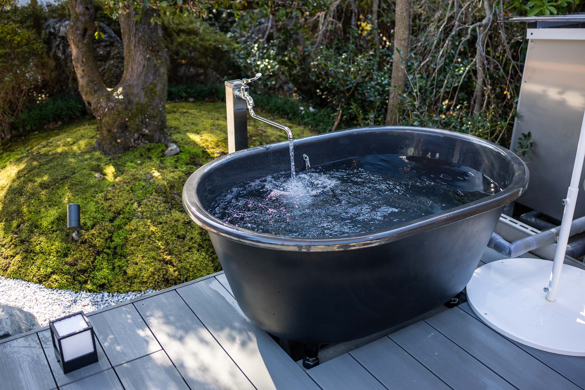 The barrel sauna can be turned on and off remotely using a
