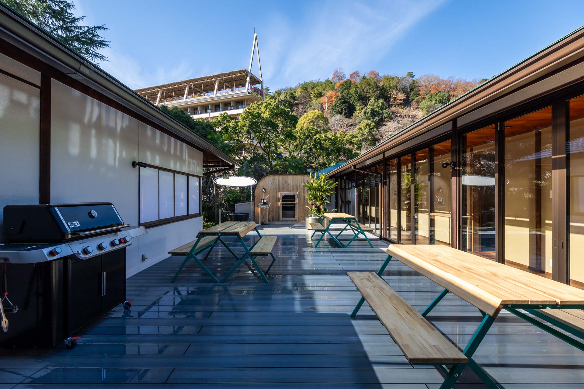 サウナで整った後は、本格グリルを囲んで賑やかに。