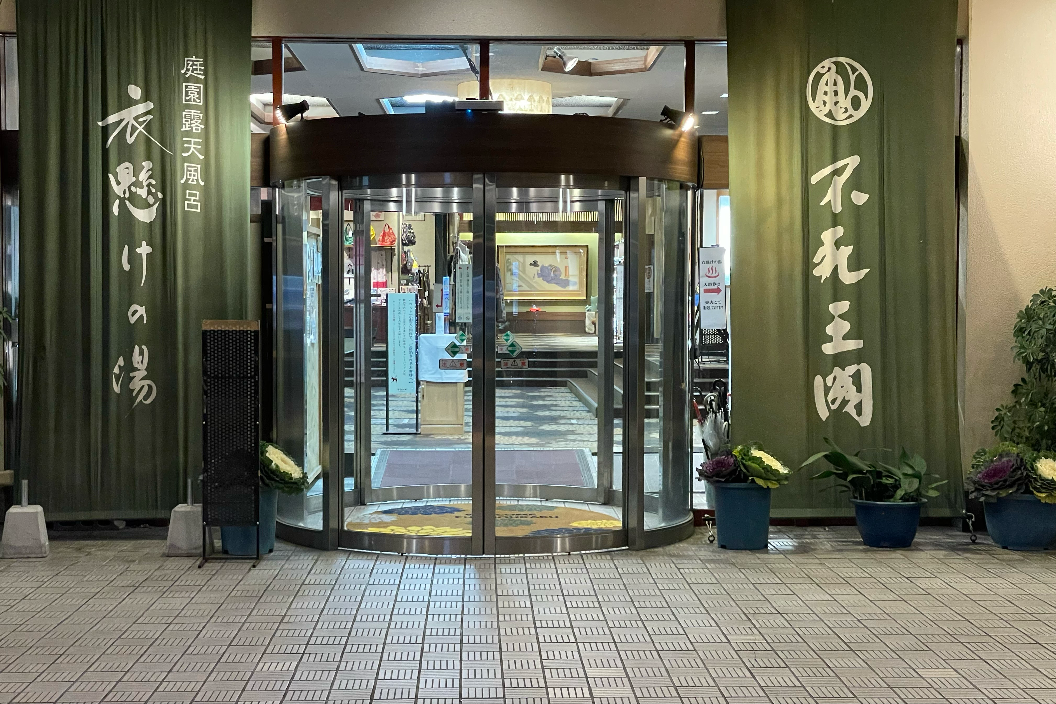 隣接する温泉旅館「不死王閣」の天然温泉は、